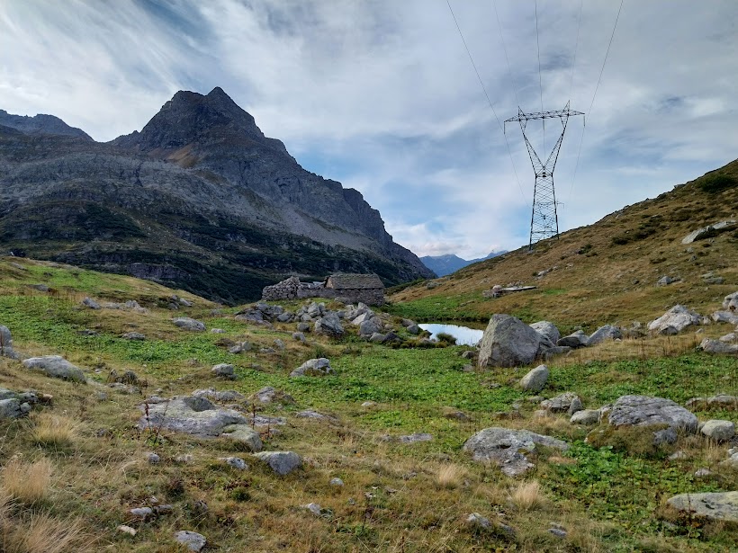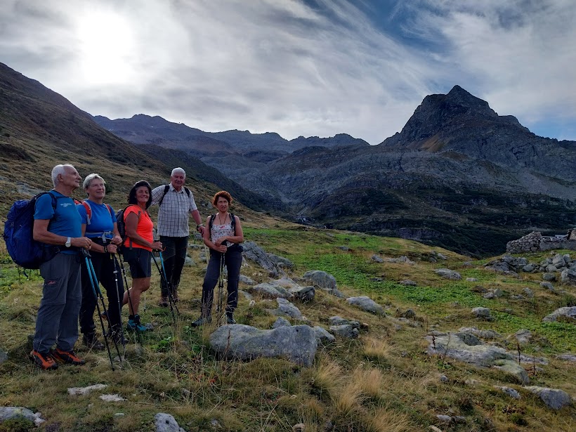 Oggi, per evitare partenze troppo veloci di cui risento solo io, gli amici mi mettono in testa al gruppo a fare il passo, da vecchio saggio o da “vaca vegia” a seconda dei punti di vista. Ci dirigiamo a nord, in dolcissima salita fino a Frua di Sopra. Qui, al bivio per l’Alpe Ghighel, inizia il sentiero G22a che fa parte del TB (Tour del Basodino). E’ evidente, diretto a oriente, destra, e il pendio diventa subito impegnativo. Nonostante il passo del vecchio, dopo un’ora siamo all’Alpe, 2125. Proseguiamo in direzione sud est, inizialmente in salita fino a congiungerci con il sentiero G22 proveniente dal Lago Castel, poi in piano fino al guado del Rio Scelp, a quota 2200 circa.