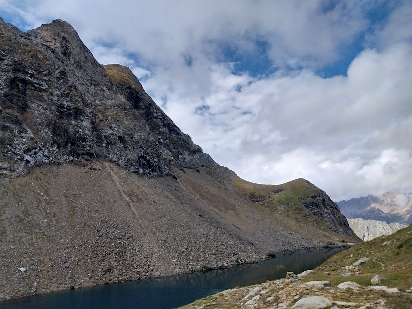 Dopo una breve pausa affrontiamo l’ultimo tratto in salita che ci porta al Lago Nero, 2428 (poco meno di un’ora e un quarto dall’Alpe Ghighel). Ci domina a meridione il Corno Talli. Percorriamo la sponda settentrionale di questo splendido specchio d’acqua, sempre lungo il sentiero G22, con l’intenzione di salire al Passo del Lago Nero, ma nuvole minacciose ad occidente placano le nostre velleità agonistiche e torniamo sui nostri passi. In un’ora ridiscendiamo all’Alpe Ghighel, mentre un pallido sole fa capolino e il tempo sembra “tenere”.